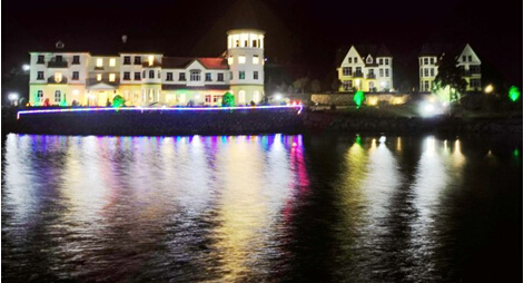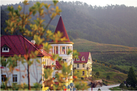 每當夜幕來臨,色彩絢麗的建筑外墻、紅褐色的斜坡屋頂、筆直高矗的圓形塔尖,與艷光四射的彩燈、璀璨迷幻的湖景融為一體,使東亞度假山莊變得華麗浪漫、溫馨迷人。